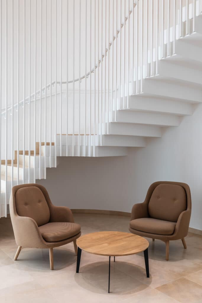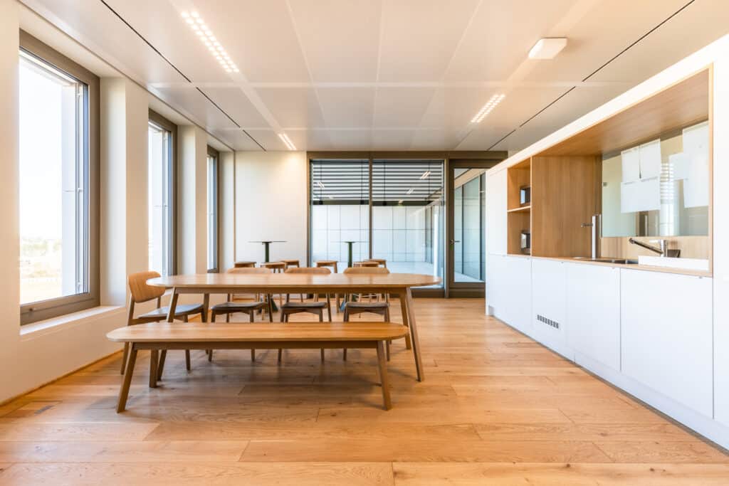 L’architecture est pensée pour le bien-être et la collaboration. Chaque étage comprend deux grands open spaces ponctués de salles de réunion modulables, d’espaces café-kitchenette et de quarante espaces collaboratifs, dont un « knowledge centre ». Le design intérieur intègre également des espaces de détente à thème et quatre loggias-terrasses ouvertes sur le quartier. Les étages supérieurs accueillent un espace VIP, une board room avec lounge et les bureaux du Group Executive Board, offrant un panorama sur le quartier.
