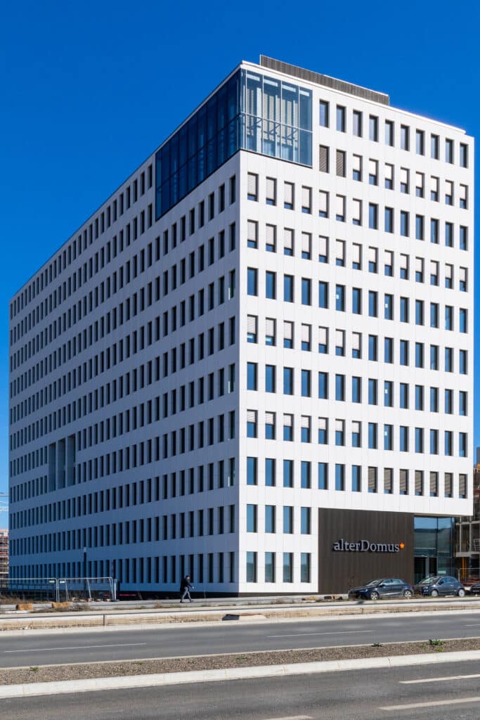 L'immeuble situé sur le boulevard Raiffeisen apparaît comme un monolithe de pierre sur un socle de métal. Sur un volume de 30 000 m3, la sobriété est animée par de grandes extrusions qui sont autant d’événements en dialogue avec l'échelle urbaine du site. Le hall d'entrée vitré double hauteur indique l'accès principal depuis le boulevard.