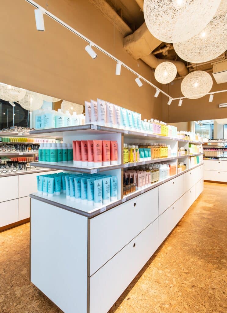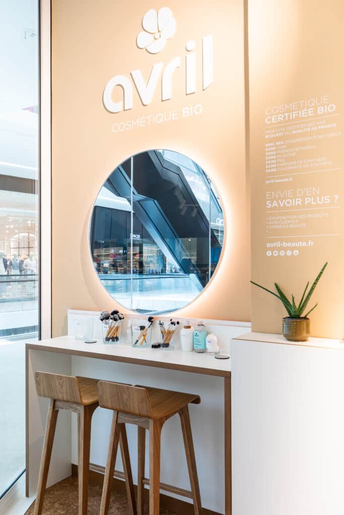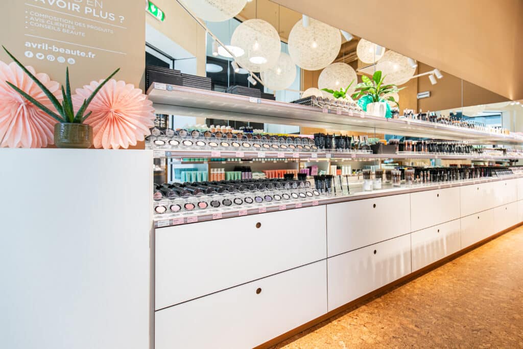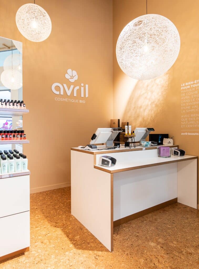 Dans cette première boutique Avril à Luxembourg située dans le nouveau centre commercial Cloche d’Or, nous avons voulu un concept aux lignes épurées, où la teinte ocre et la matérialité naturelle prédominent. Le mobilier blanc aux chants en bois permet de mettre en avant les produits aux teintes pastelles, le sol en liège et les suspensions rondes et blanches confèrent à l’espace légèreté et douceur et dégagent ainsi une atmosphère chaleureuse. La balade au milieu des présentoirs des produits de beauté devient un réel moment de détente.