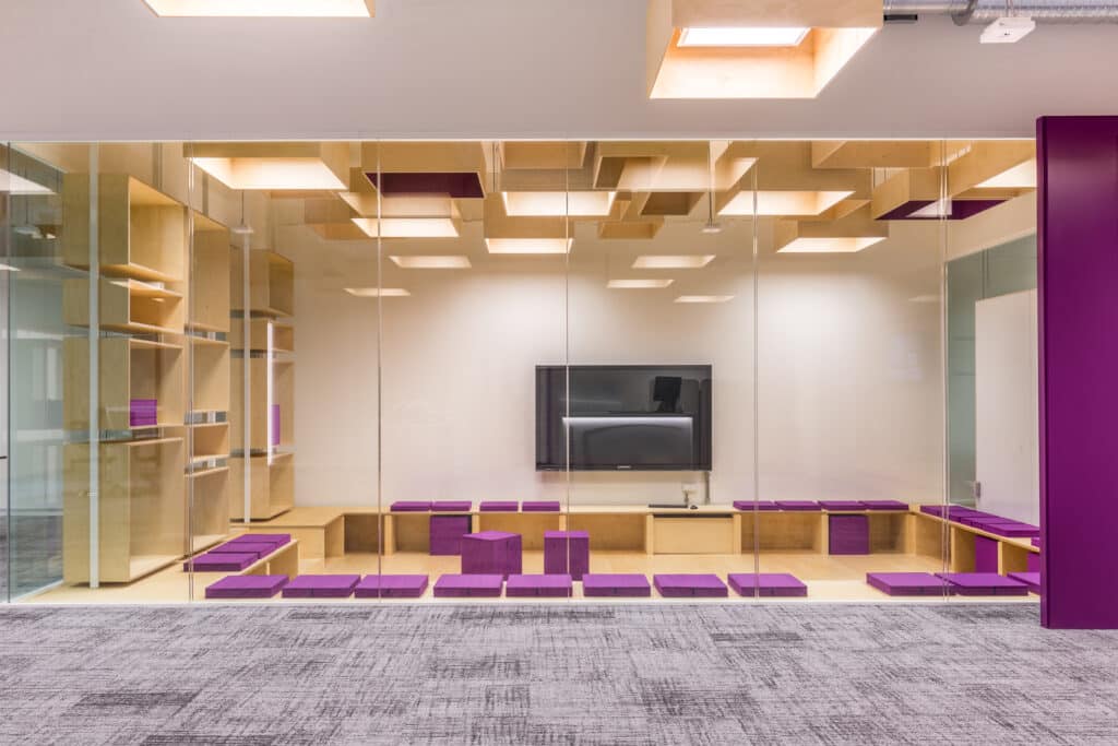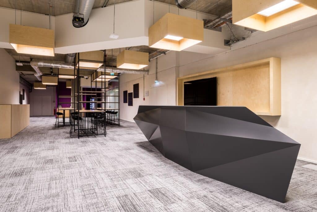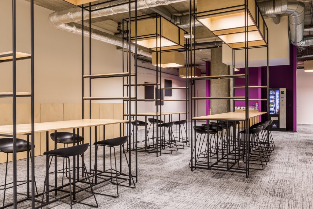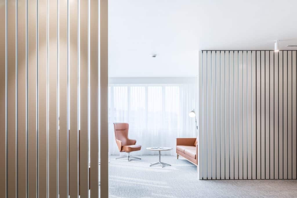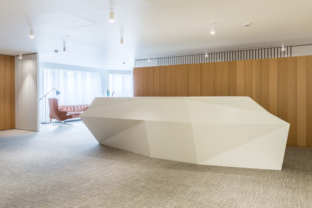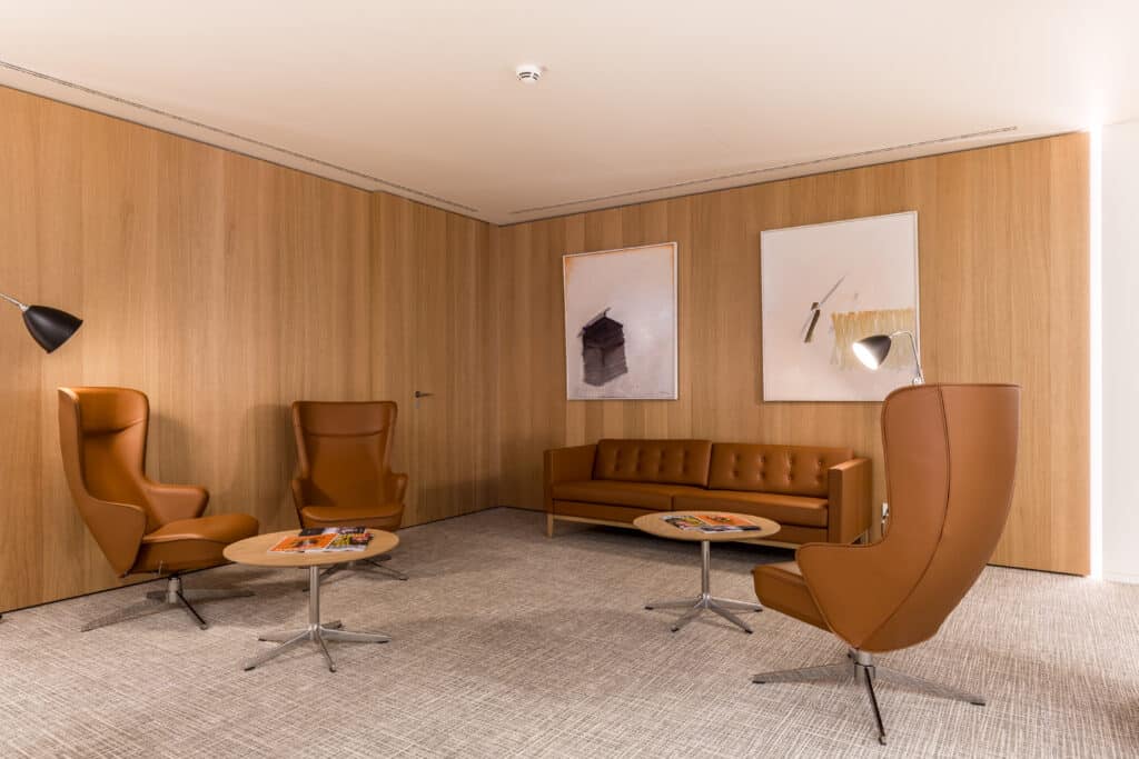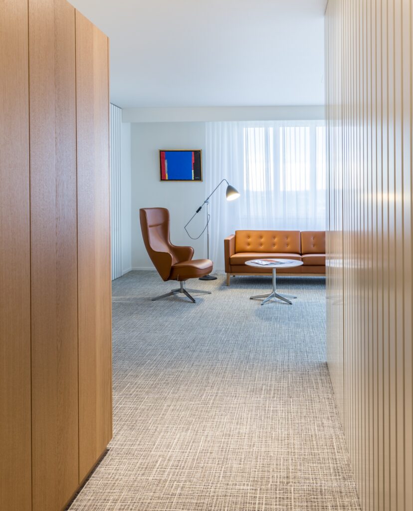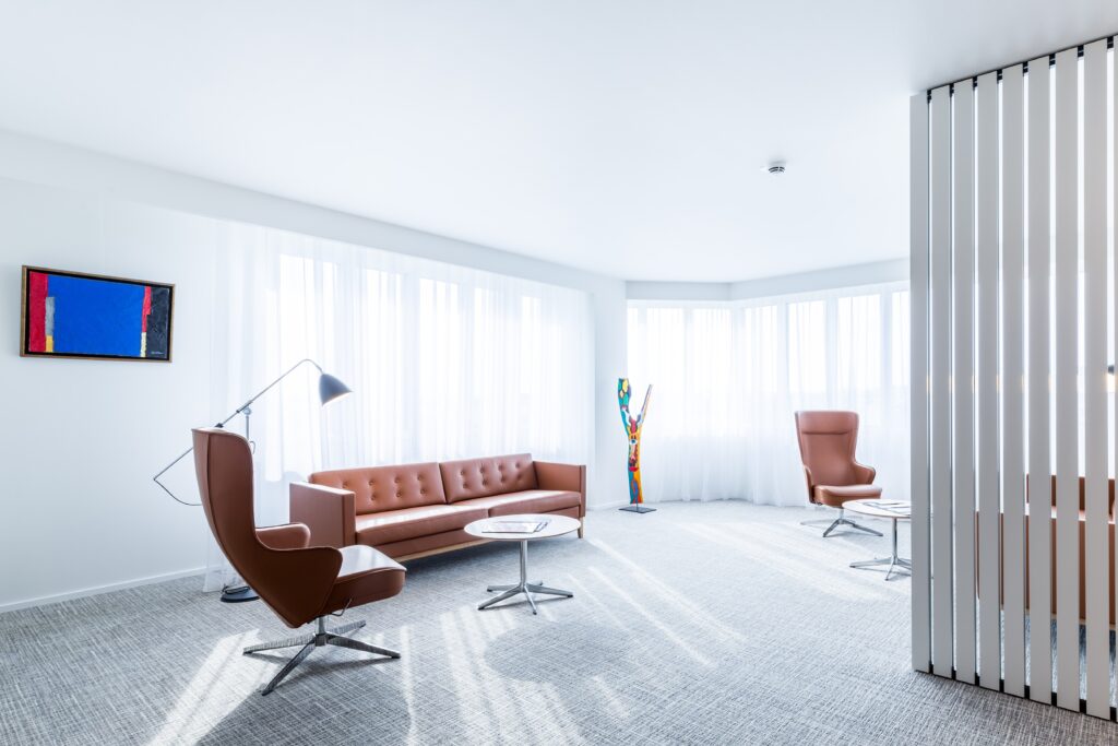 Les salons clients, situés au dernier étage du bâtiment, ont fait l’objet d’une rénovation complète. Le nouvel aménagement met en valeur l’architecture existante et les vues extérieures, offrant un cadre élégant, convivial et inspirant.