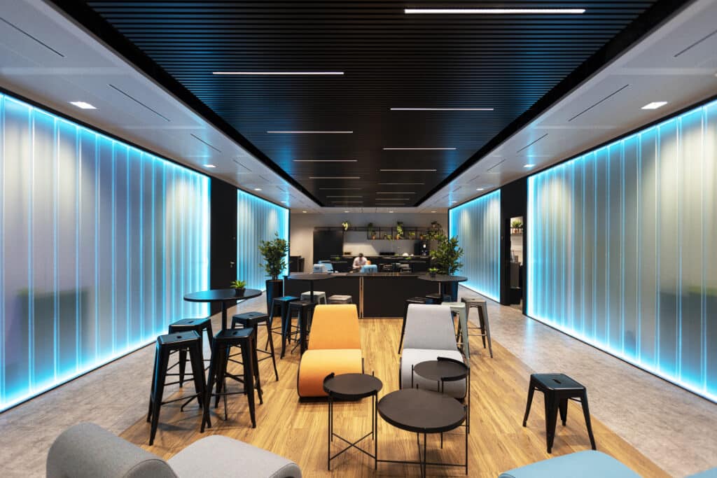 Innovant et créatif par ses compositions et diverses formes, l’aménagement reflète le dynamisme d’entreprise de l’occupant.