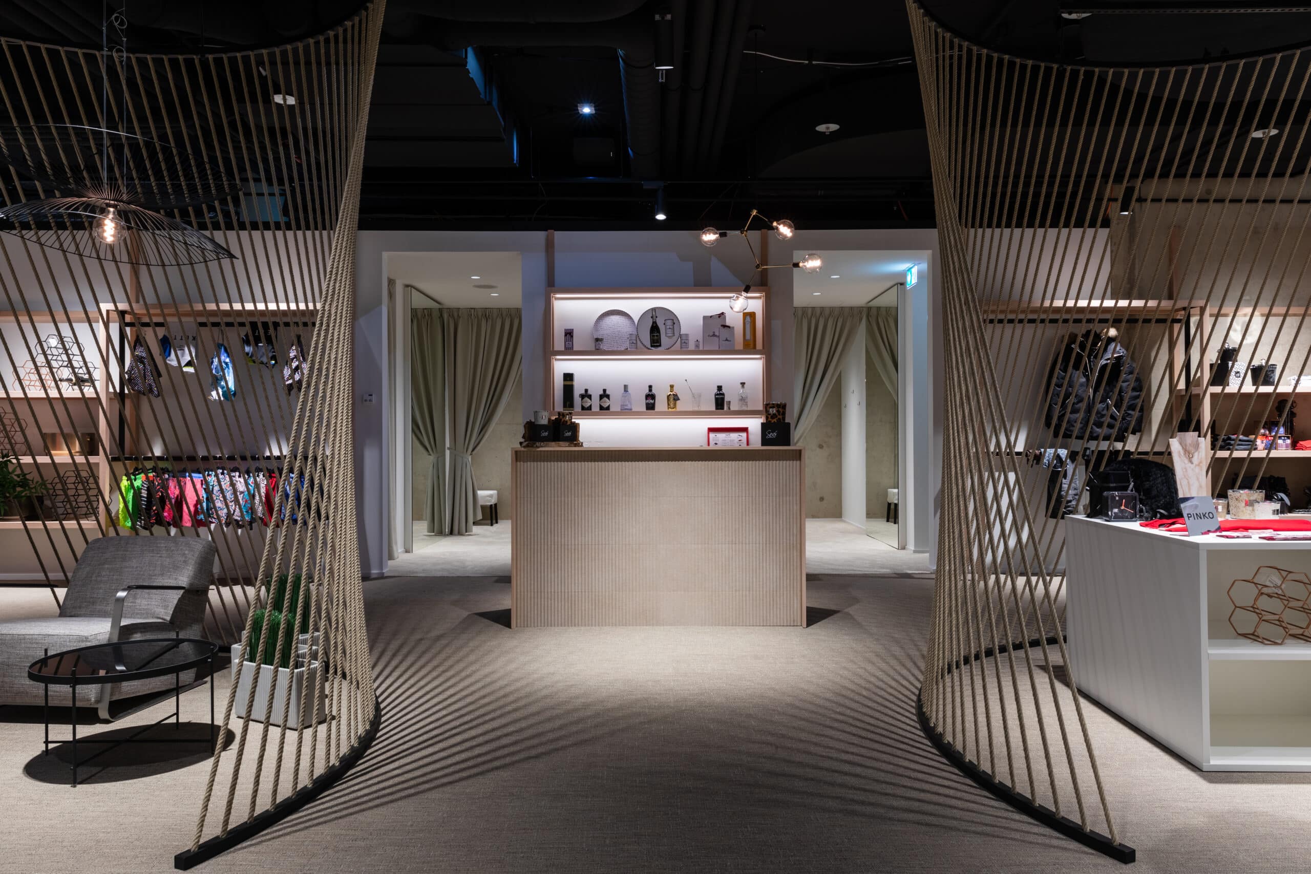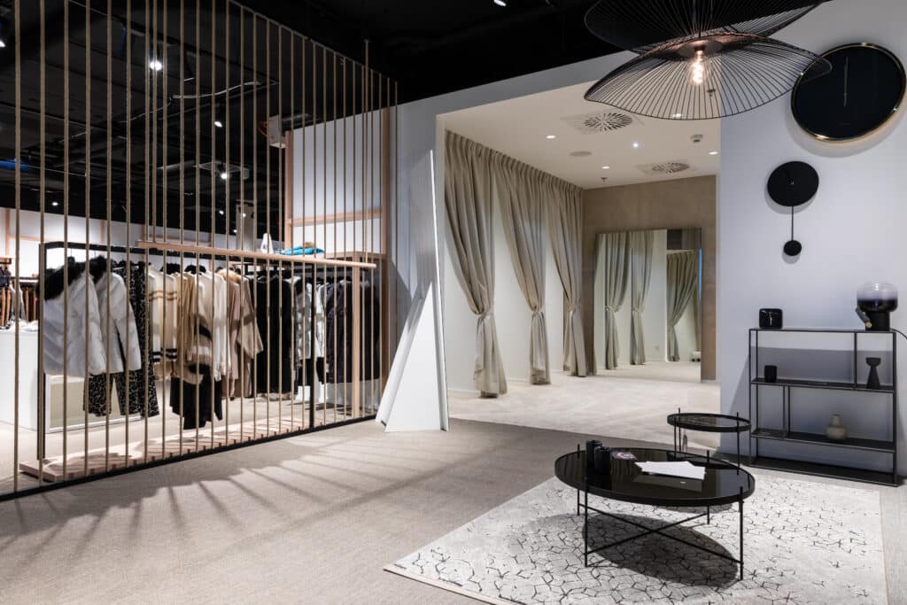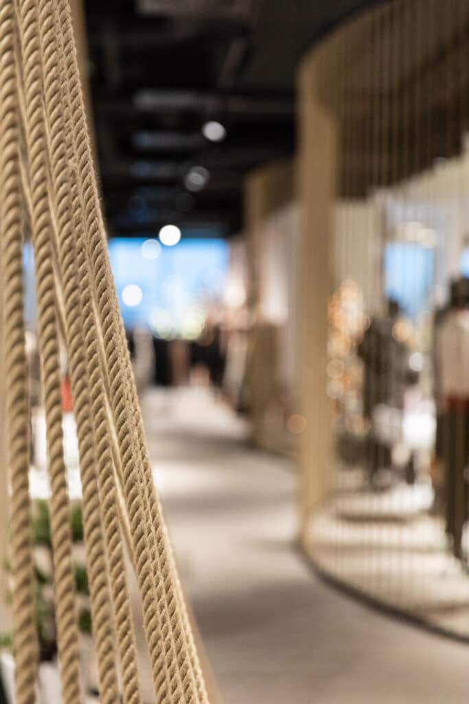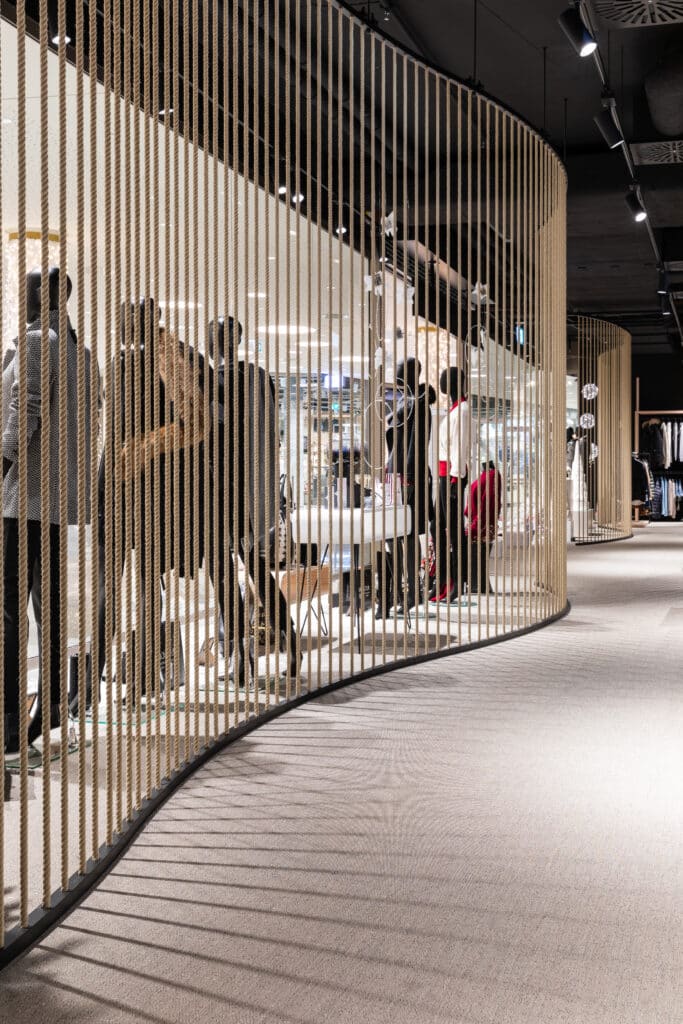 L’entrée de ce concept store est mise en valeur par une structure de cordes ouvrant l’espace sur un espace de bar à champagne et gin tonic. Le chemin formé par les différents présentoirs font prendre au shopping l’allure d’une délicieuse balade. Les cabines d’essayage sont conçues dans une ambiance feutrée, pour se sentir comme à la maison. Au détour des rayons de prêt-à-porter et d’accessoires, vous découvrirez çà et là de la petite décoration pour la maison : fauteuils, tables d’appoint, tapis, …