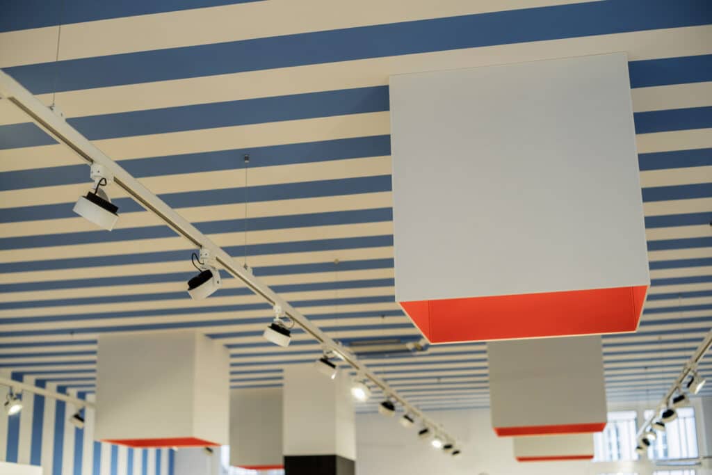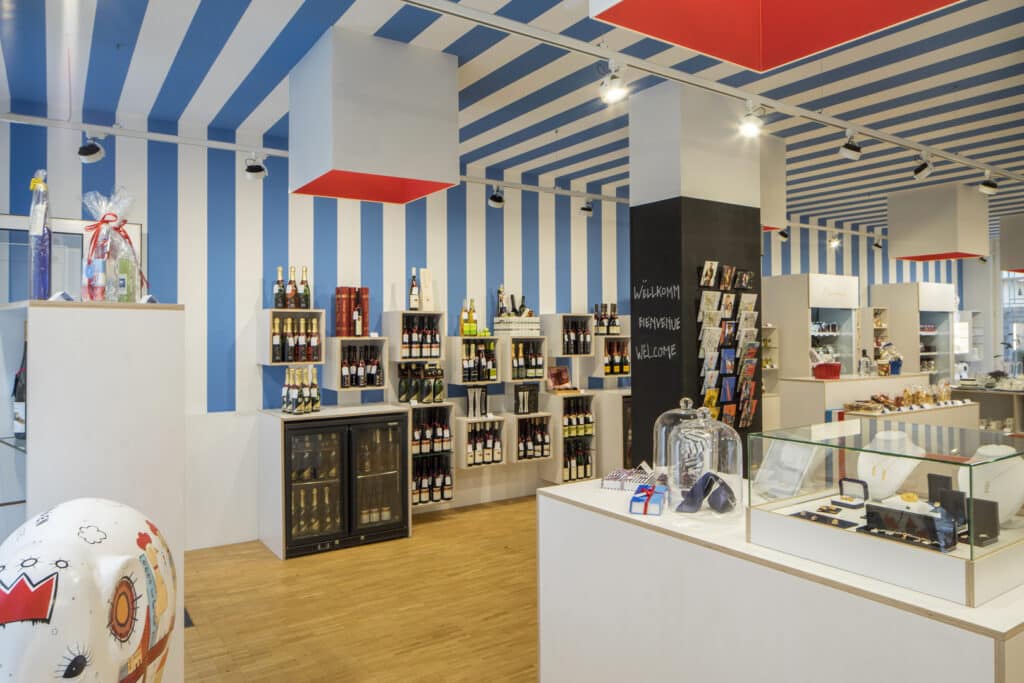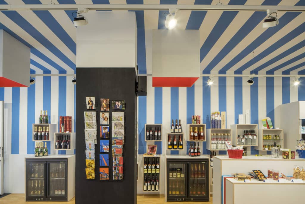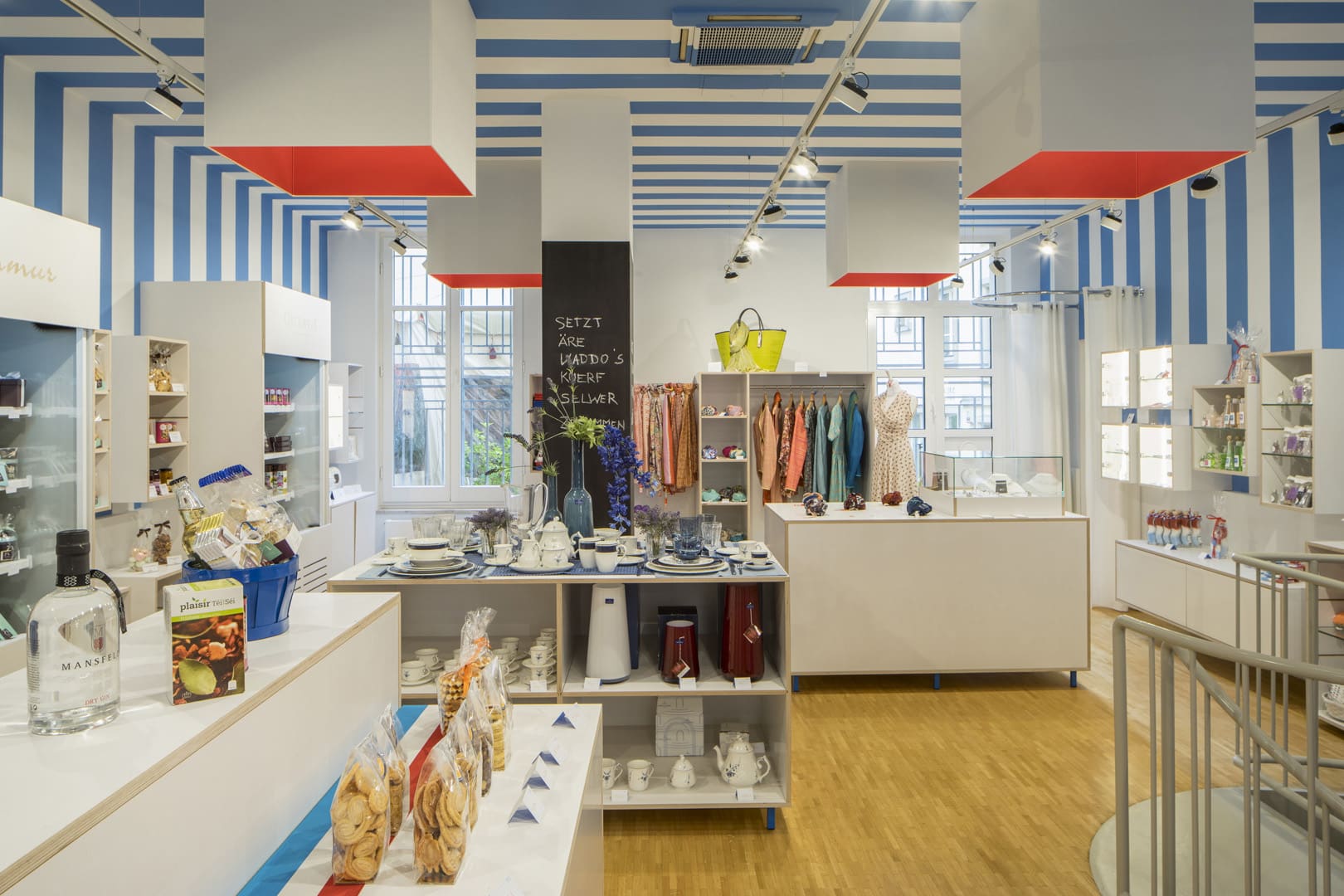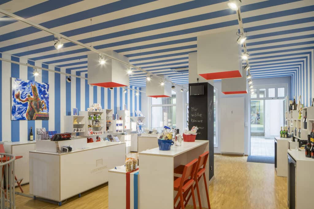 Le concept était de regrouper une quantité d’articles des plus variés représentant la diversité des produits nationaux allant des plaisirs de la bouche à la confection en passant par les accessoires, les bijoux, les livres, etc.. L’approche a été de contenir tous ces produits en les logeant dans des cubes en bois blanchis de dimension adaptée. Cette démarche a permis de définir une identité sobre, naturelle et claire. L’ensemble de ces boîtes se retrouvent logées sous un jeu de bandes régulières peintes en bleu au plafond et aux murs faisant référence au drapeau grand-ducal. Enfin les lampes existantes au plafond ont été prolongées afin de baliser l’espace et de donner un surlignage chromatique rouge dans le but de compléter les couleurs de la nation.