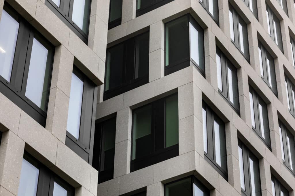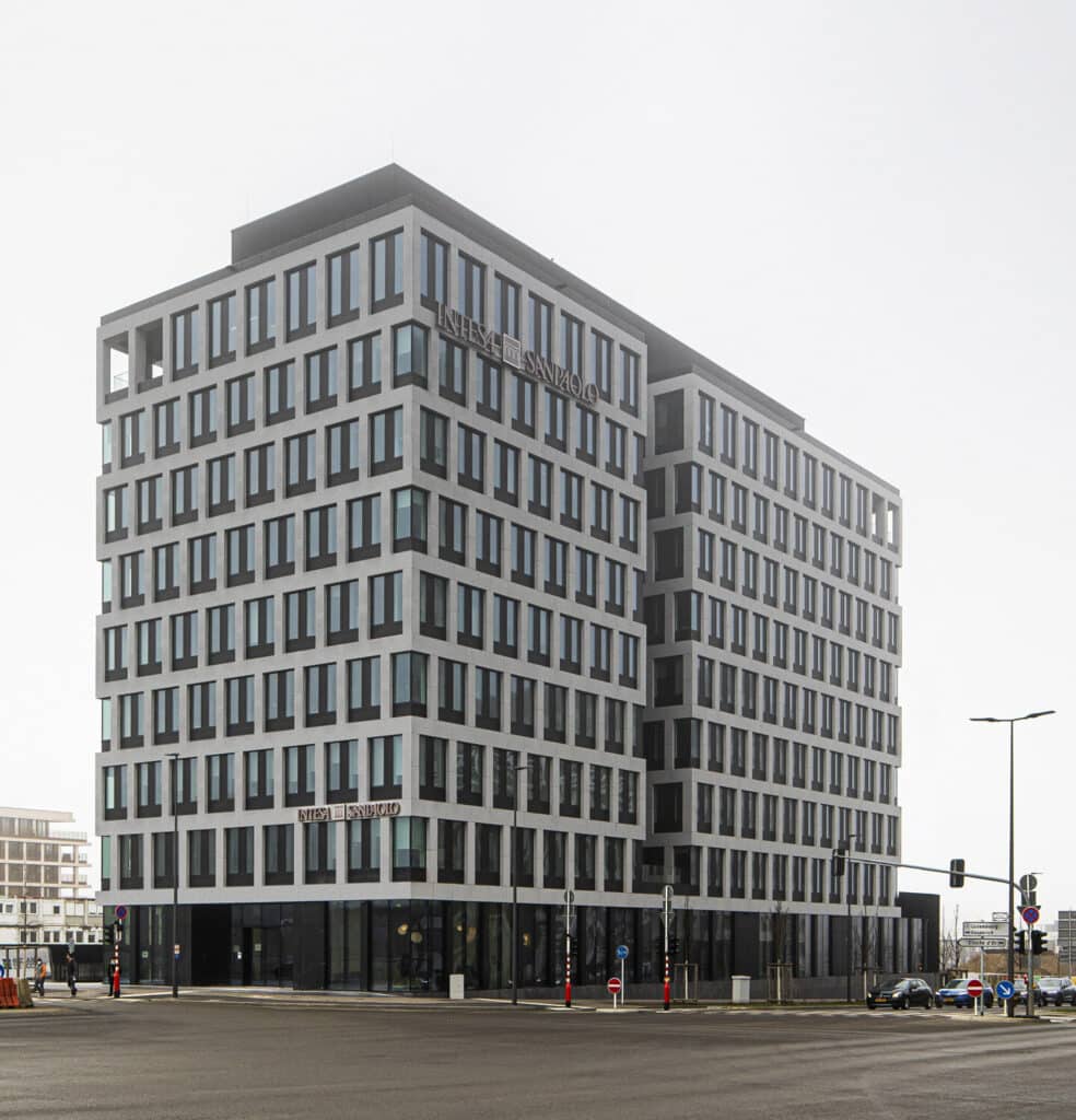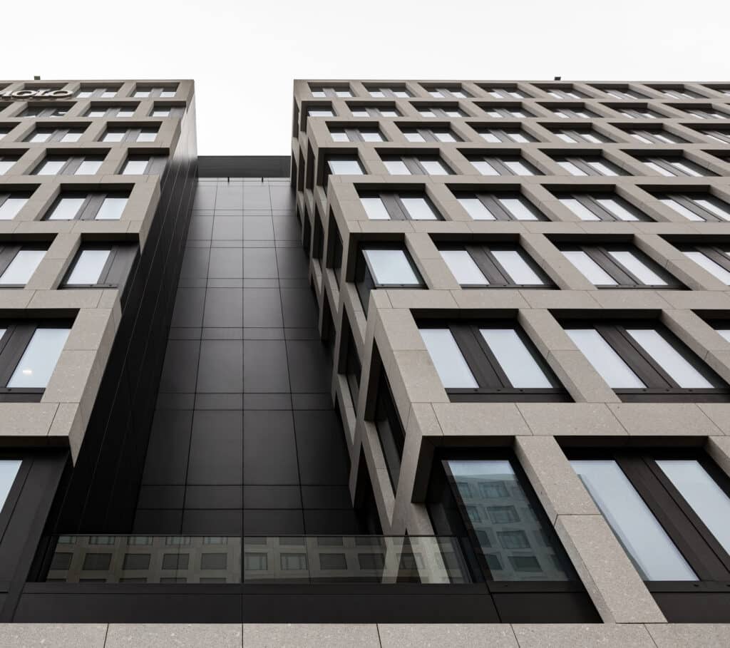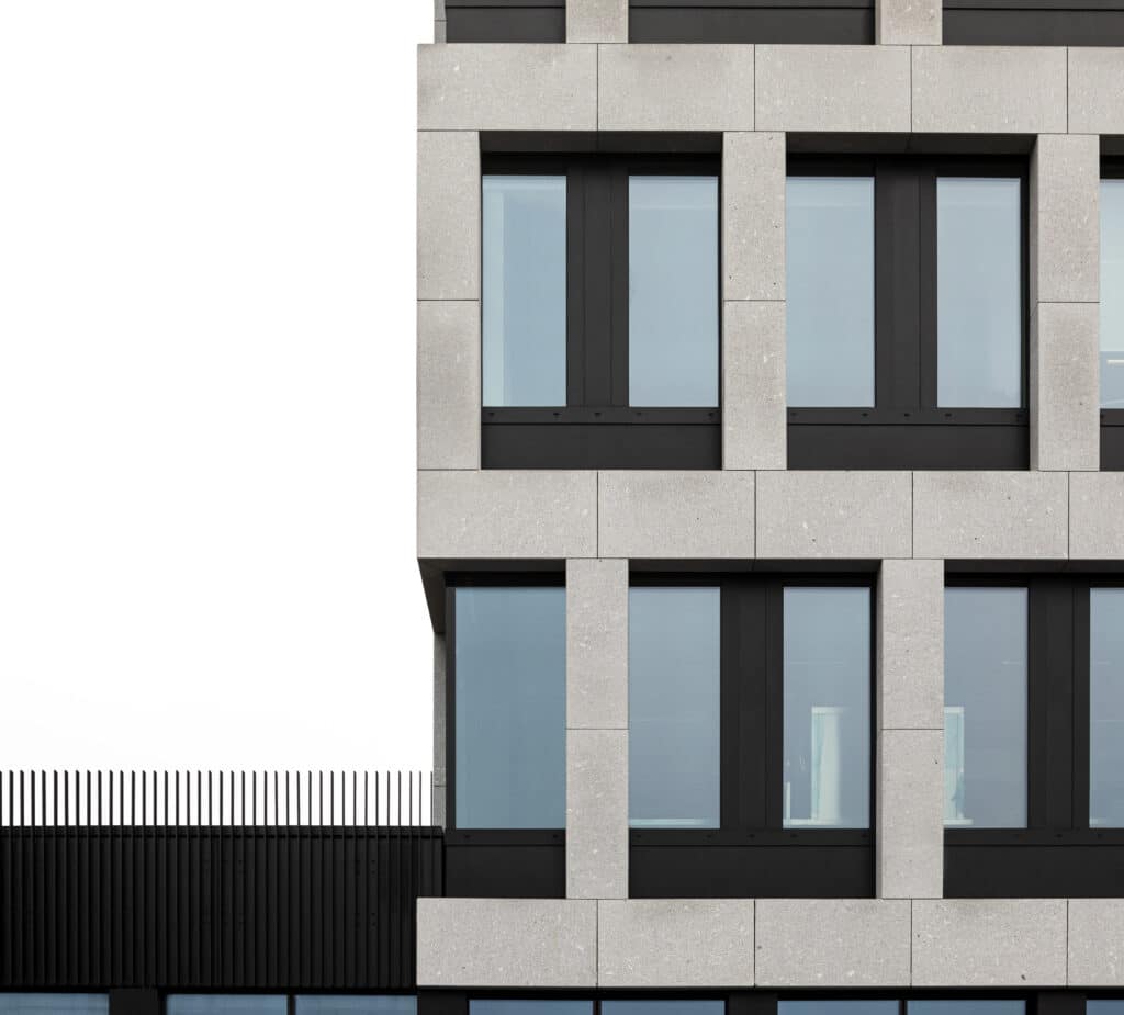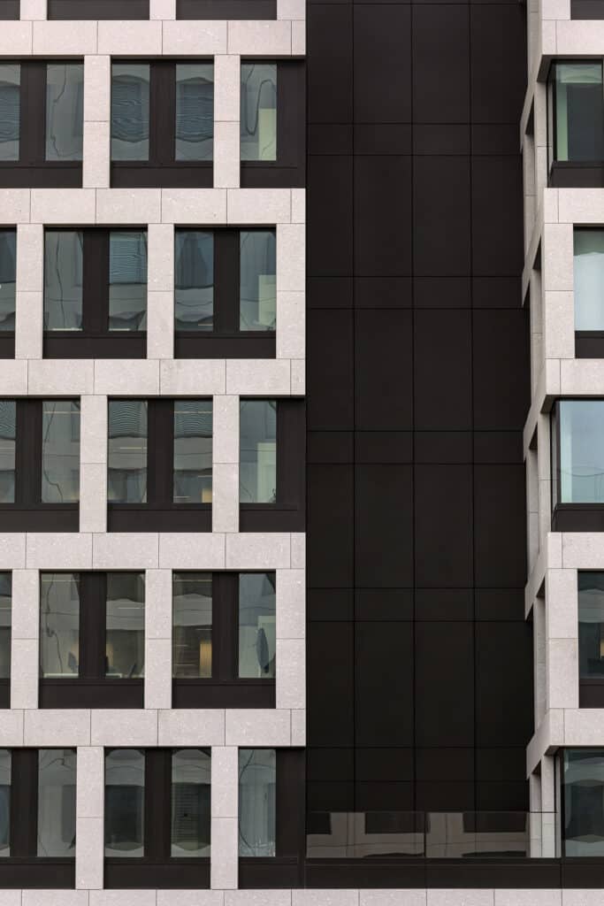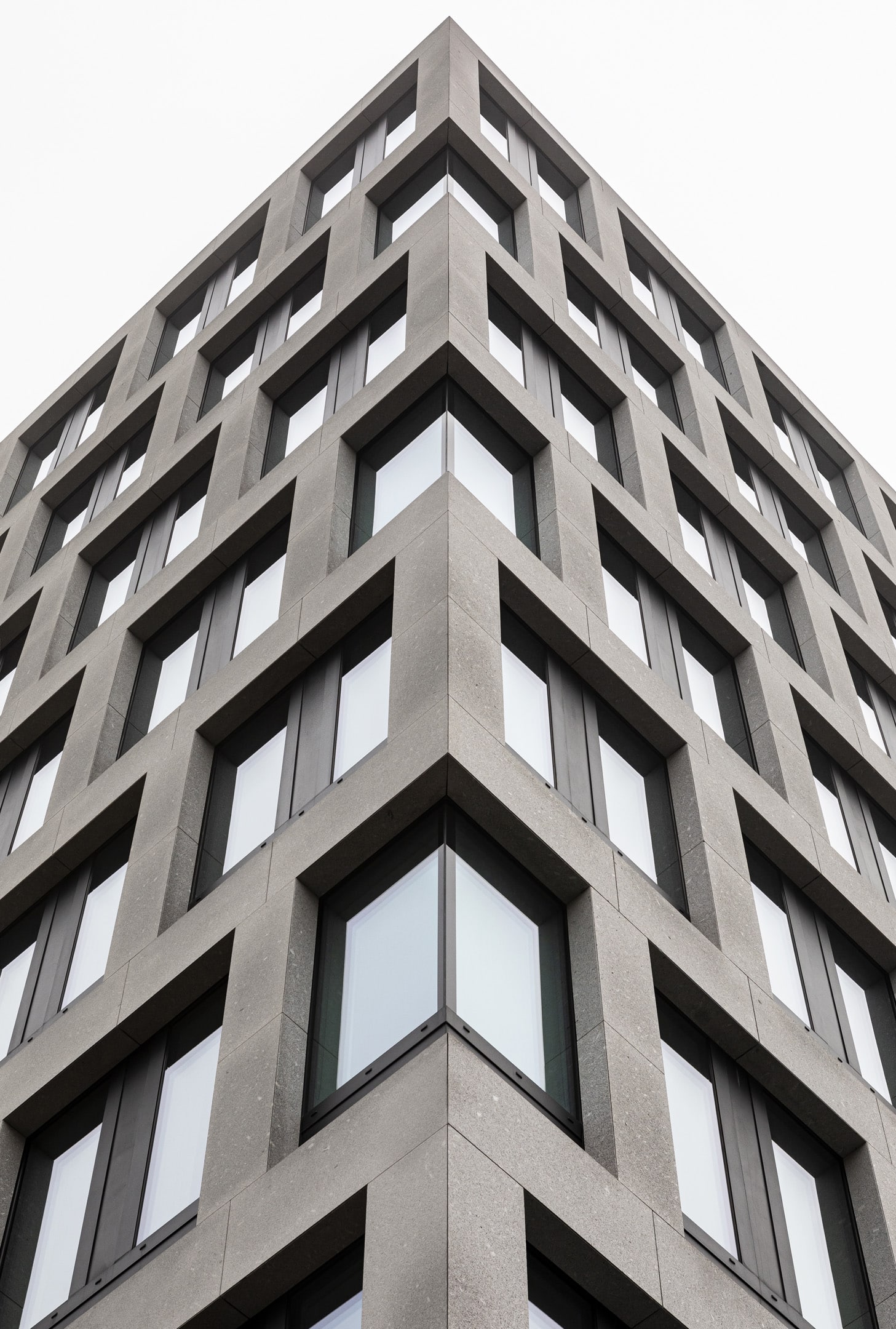 Le concept architectural de l'immeuble repose sur la création d'une première enveloppe métallique foncée et vitrée qui repose sur un socle transparent. Cette enveloppe est recouverte d'une seconde peau en pierre naturelle rugueuse et massive qui se pose en quinconce. Les arêtes et les retraits du bâtiment exposent le contraste et le mouvement entre les deux peaux de la façade.