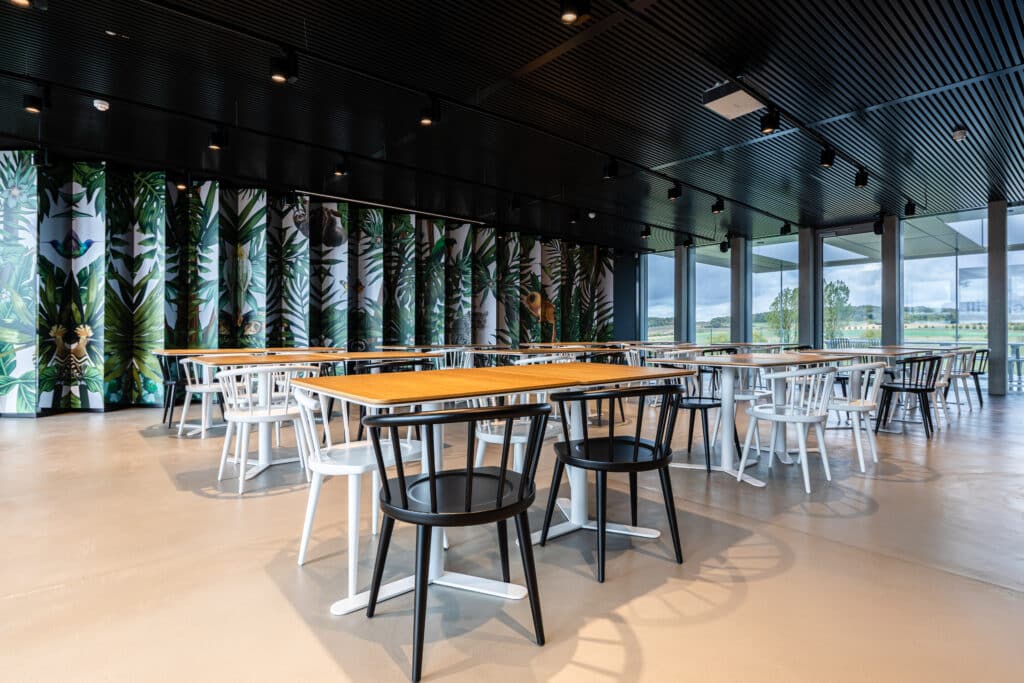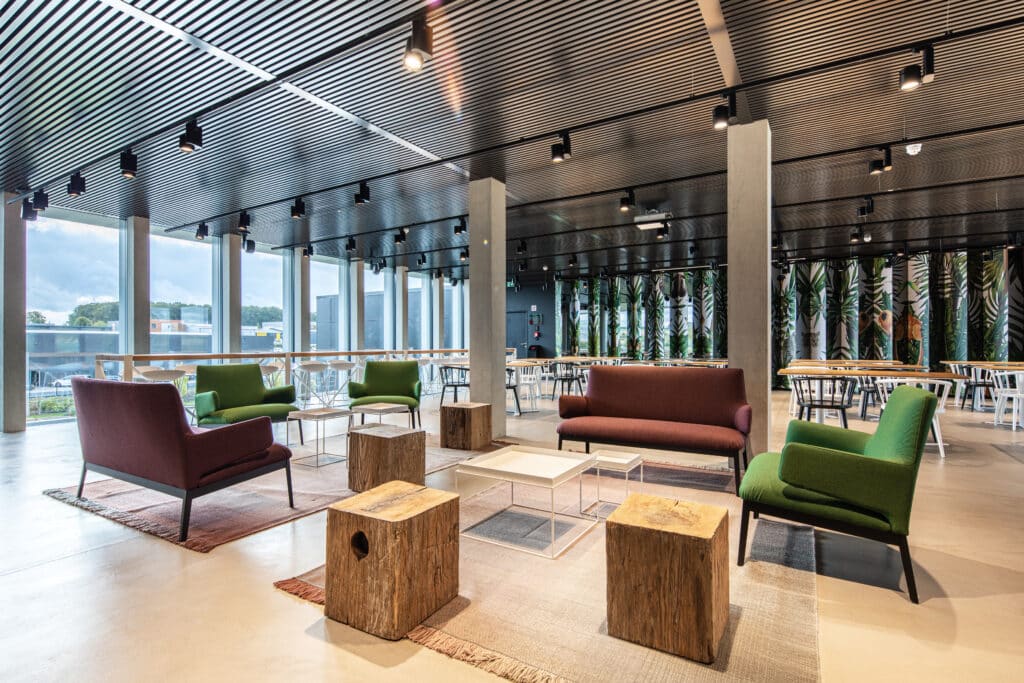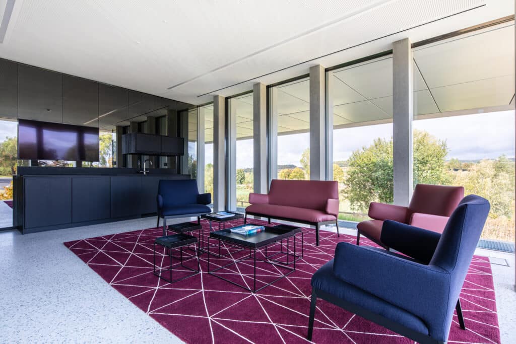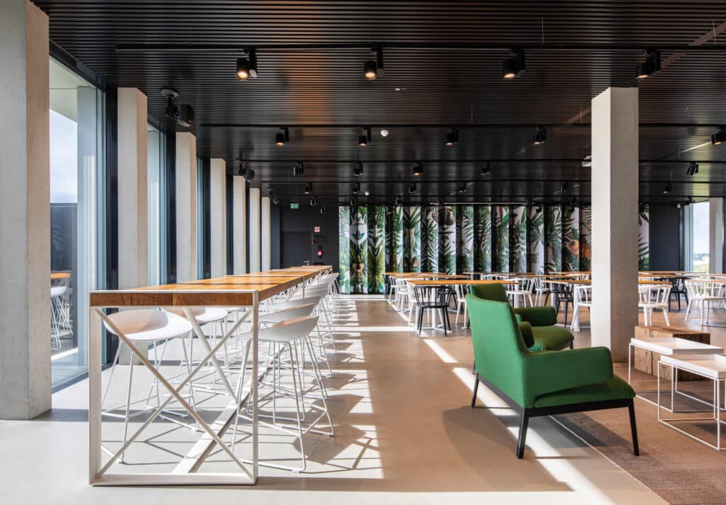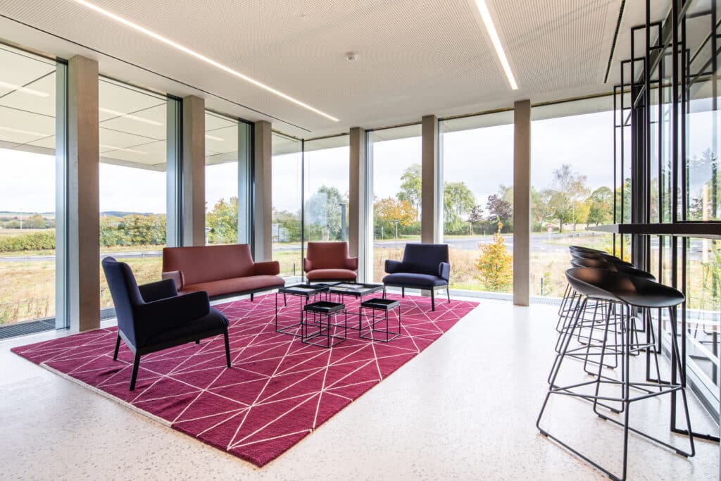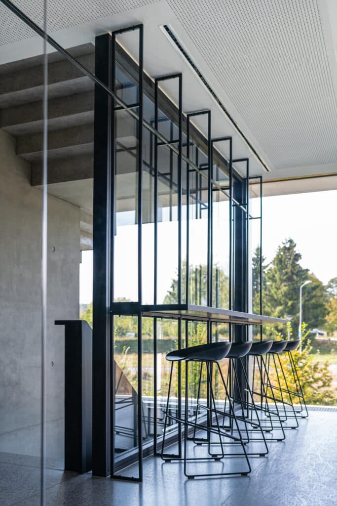 Les façades largement vitrées permettent un apport en lumière naturelle optimal. Les espaces s'ouvrent généreusement vers l'environnement paysager qui entoure l'édifice. La certification HQE est également un fondement de ce processus de conception et de construction.