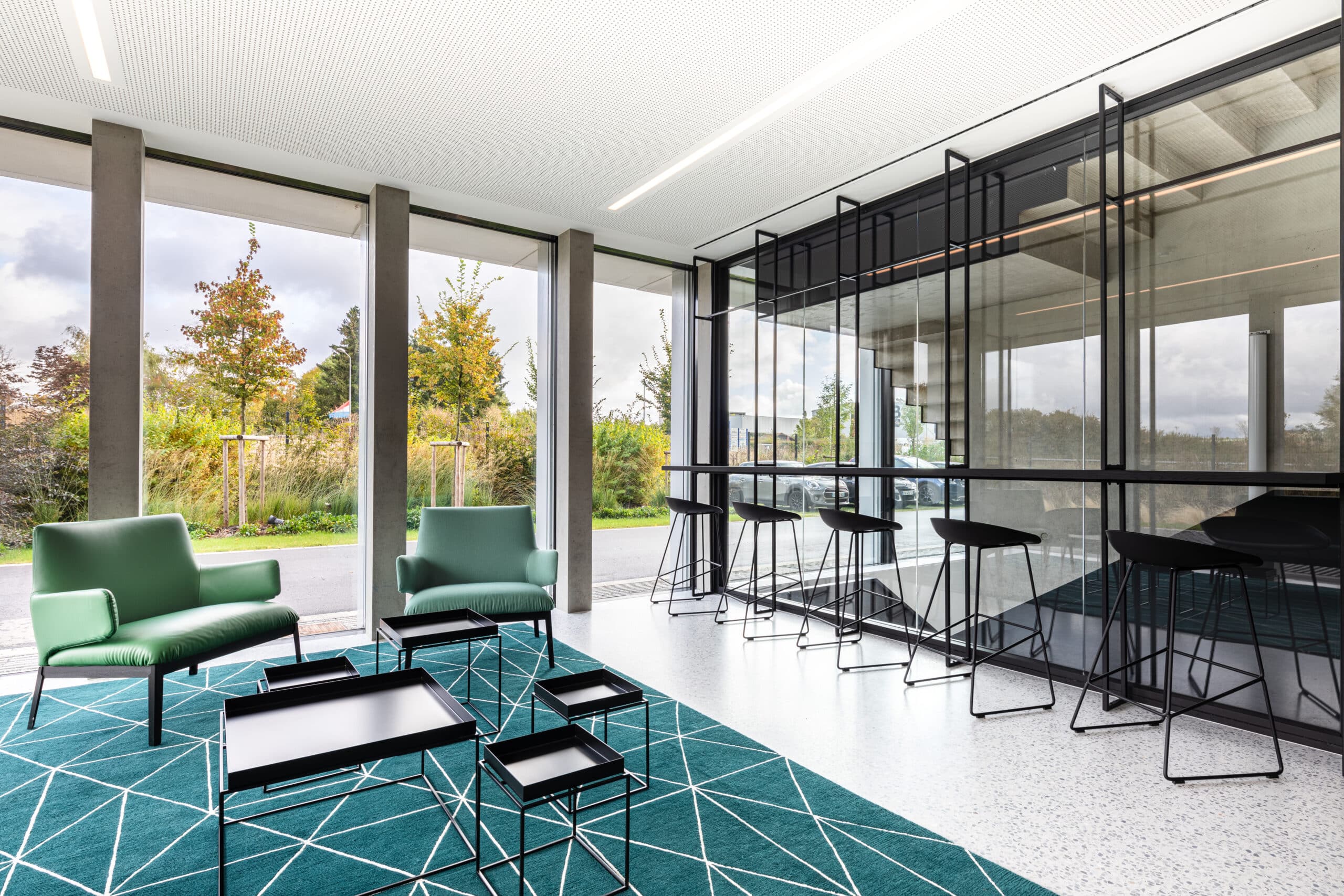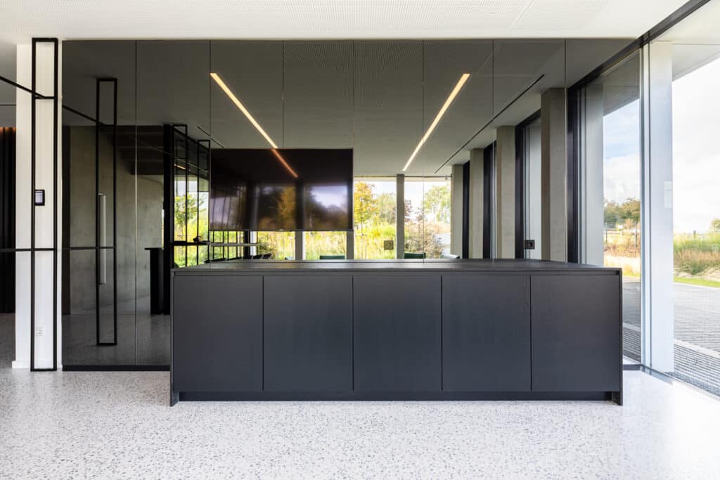 A l'intérieur, béton brut, terrazzo, acier noir et chêne noir sont le fil conducteur et offrent une lecture globale du projet. A ces matérialités, quelques notes végétales apportent un contrepoint et font entrer la nature dans le bâtiment.