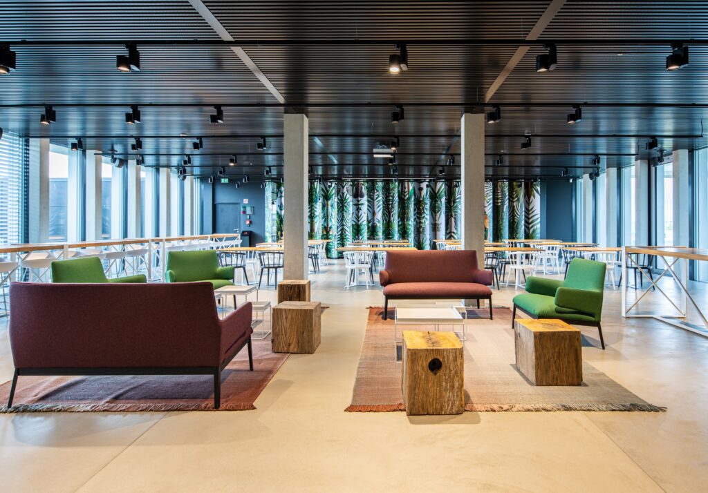 Il s'élève sur trois niveaux décalés les uns par rapport aux autres. Ces glissements d'étage en étage apportent du dynamisme à la construction. Le bien-être au travail étant l'essence de la conception de ce projet, la partie administrative et le hall industriel s'articulent autour d'un noyau central regroupant l'ensemble des espaces communs et des zones de détente souhaités par l'entreprise : réfectoires, coffee corners, vestiaires, fitness, etc.