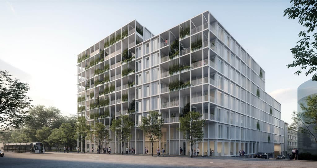 Ce projet, présenté dans le cadre d’un concours et lauréat du deuxième prix, a été développé en collaboration avec le bureau A2M. Il répond à une demande architecturale complexe : intégrer un programme multifonctionnel, une forte densité, un îlot compact et des raccords urbains précis. La réponse apportée se veut simple et globale, articulée autour d’un concept fort : la maille végétale, qui incarne la cohérence recherchée entre les différentes dimensions du projet.