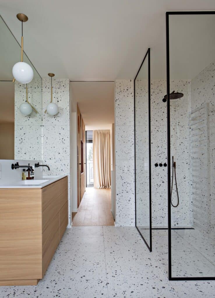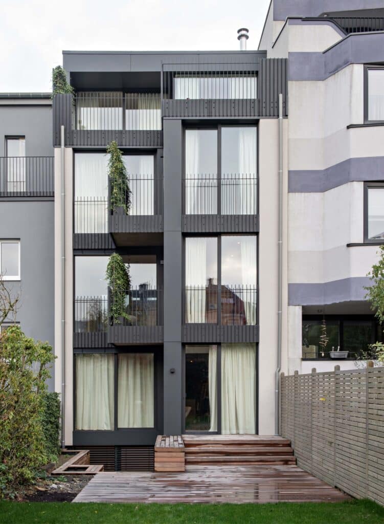 Sur le plan technique, le projet vise une haute performance énergétique : les façades sont isolées, la toiture plate entièrement isolée, les fenêtres triple vitrage et le système de chauffage avec une chaudière à gaz assurent un confort thermique. Ces travaux ont permis de moderniser la maison tout en respectant son caractère architectural et son intégration dans un ensemble urbain complexe.