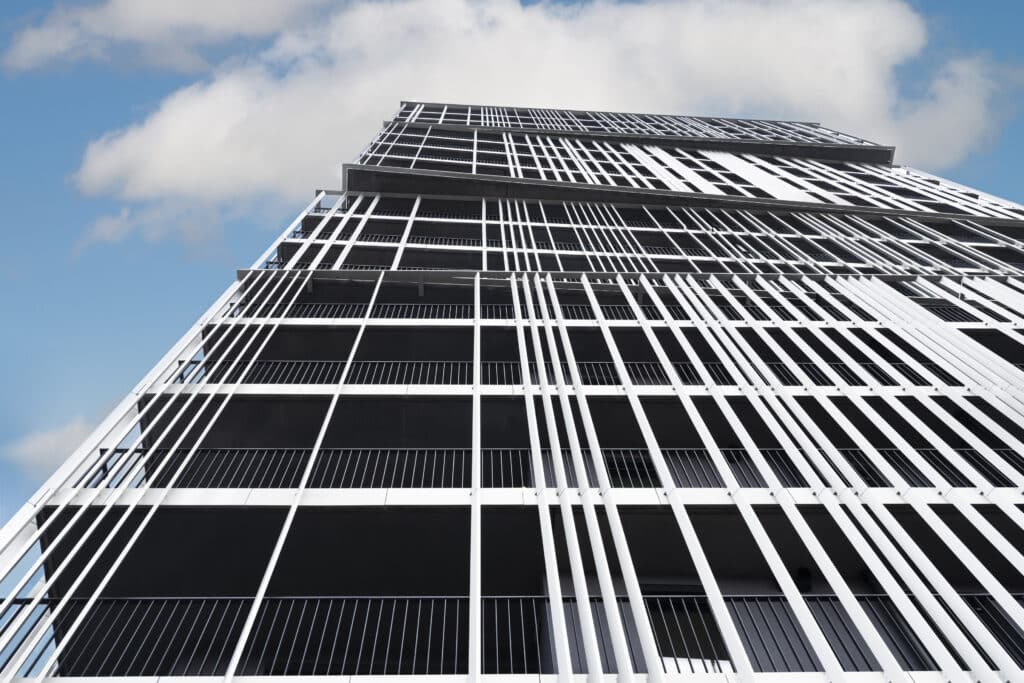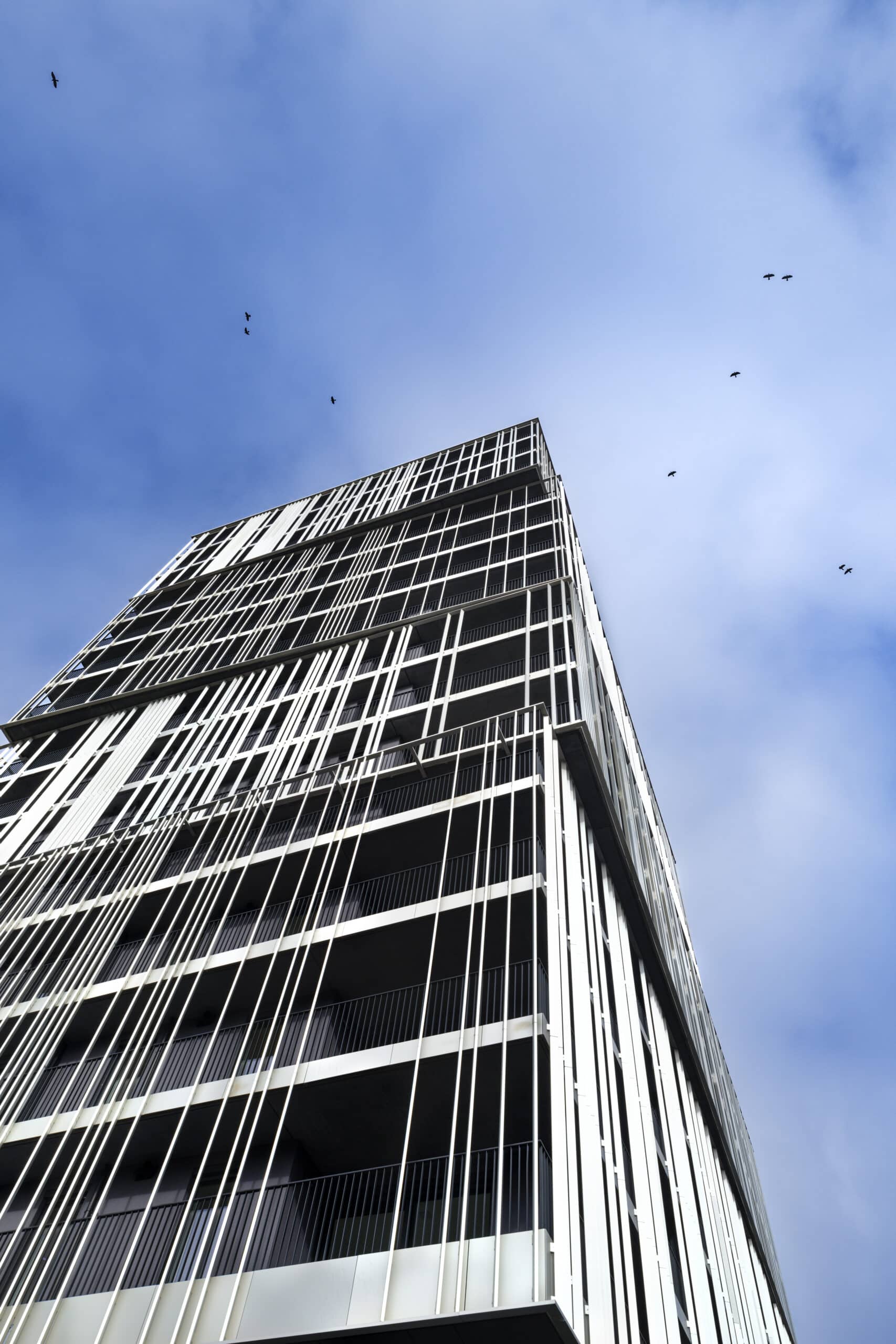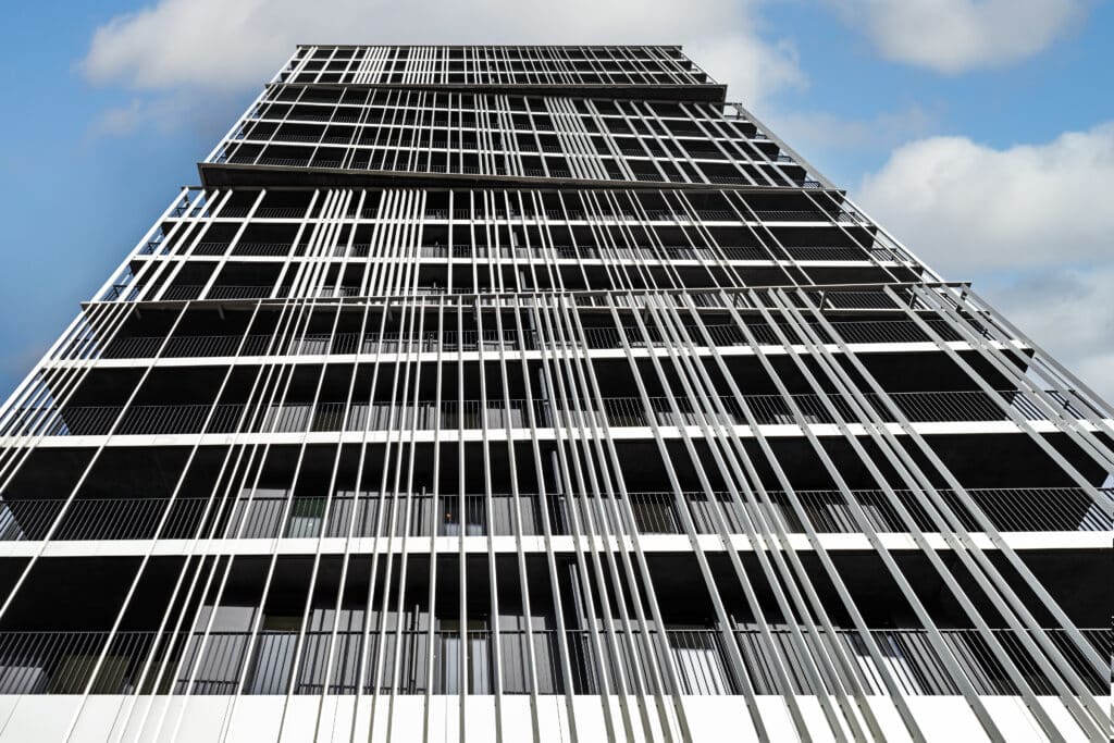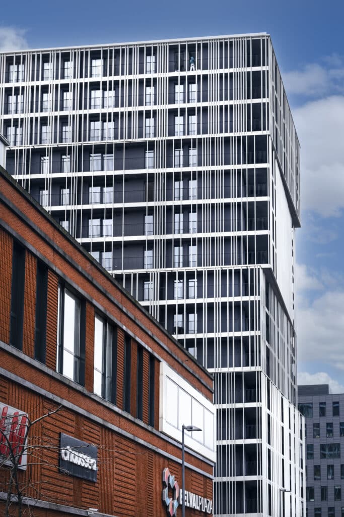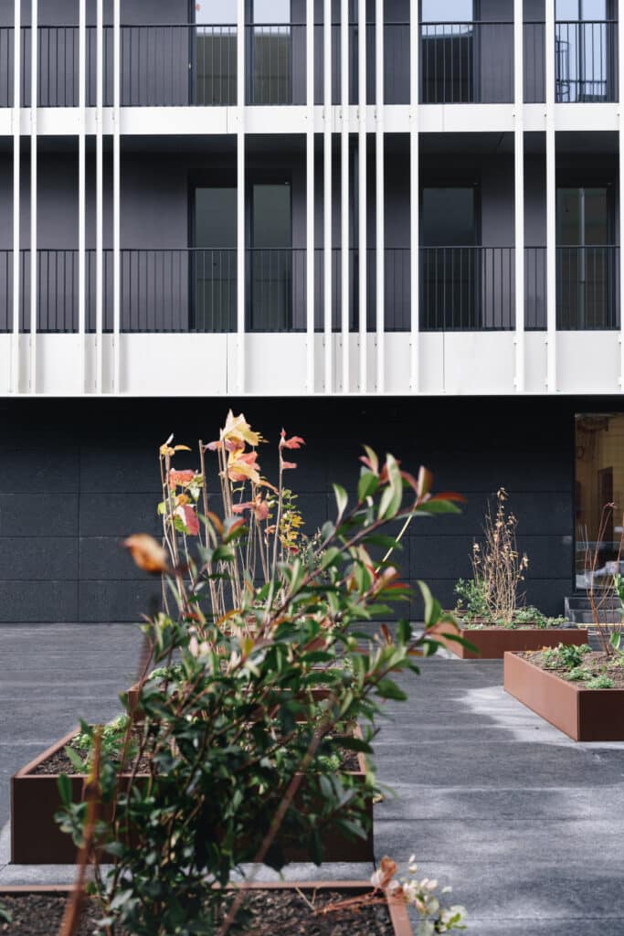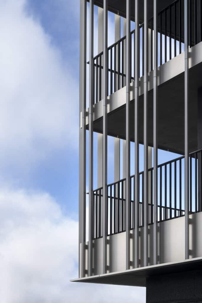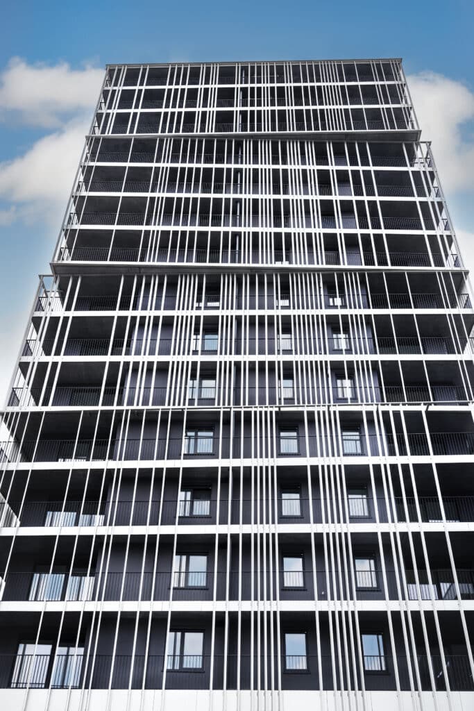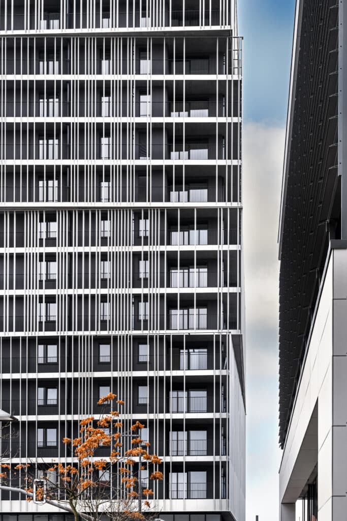 Chaque coursive des logements exprime le caractère vivant et habité de ce programme urbain, il est massif mais ouvert vers la ville. Les reflets offerts par le socle de verre et l’anodisation de la peau métallique en font un projet sobre et lumineux.