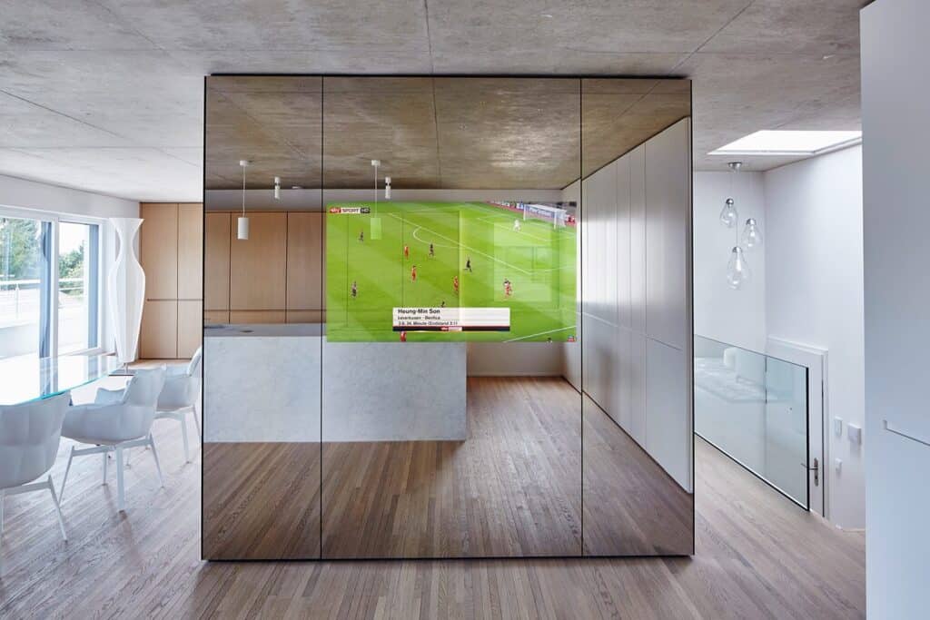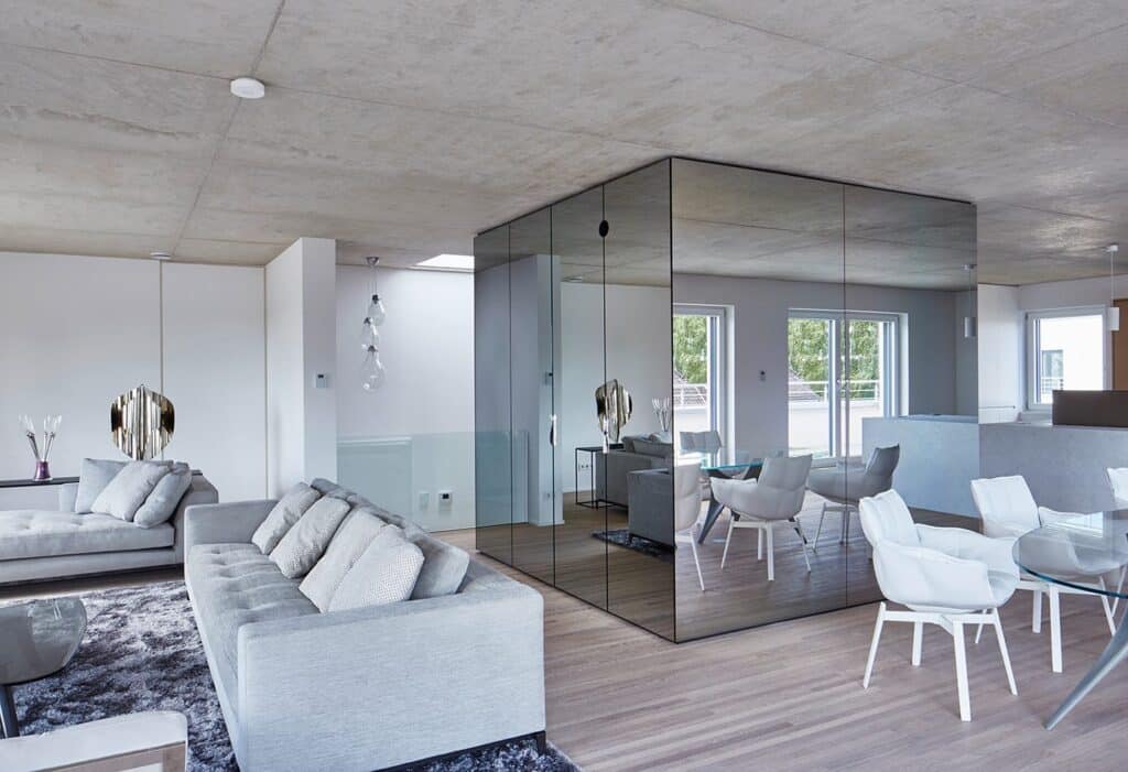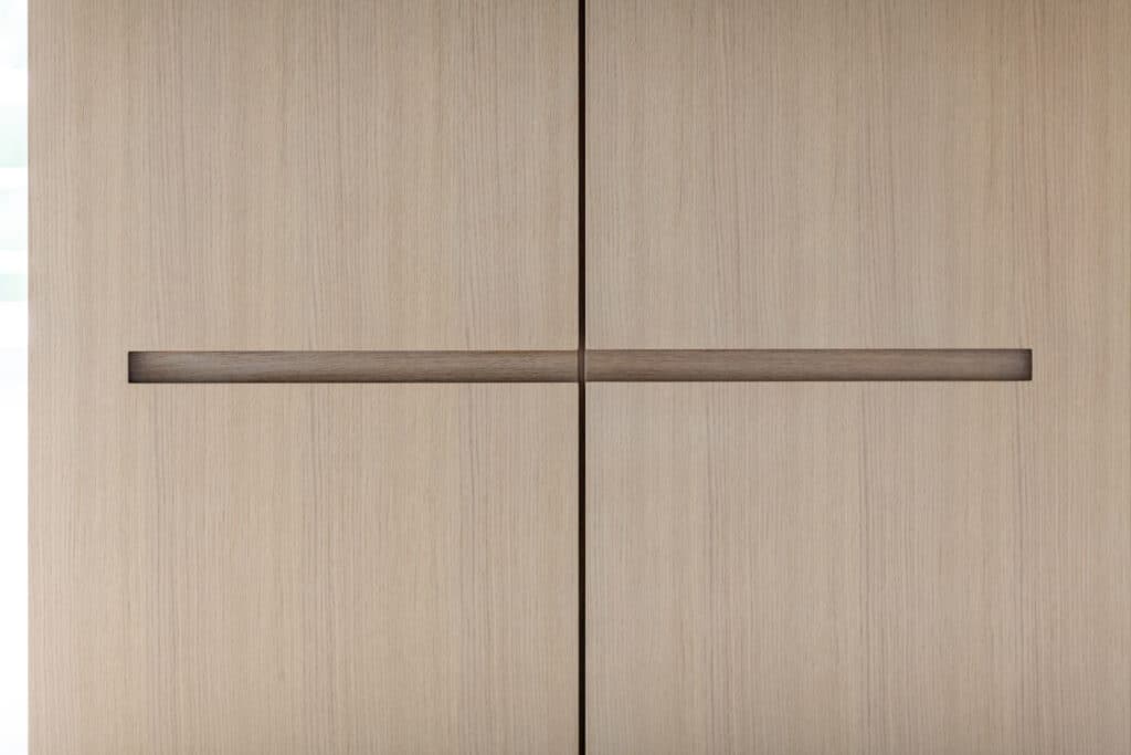 Les spécificités des besoins de l’occupant ont nécessité un travail particulier sur les espaces. En découle un aménagement sur mesure, avec des espaces fortement ouverts, communiquant les uns avec les autres. L’ensemble du mobilier a été conçu sur mesure.