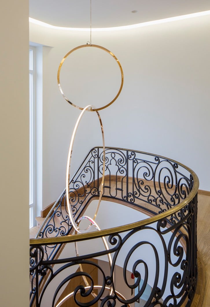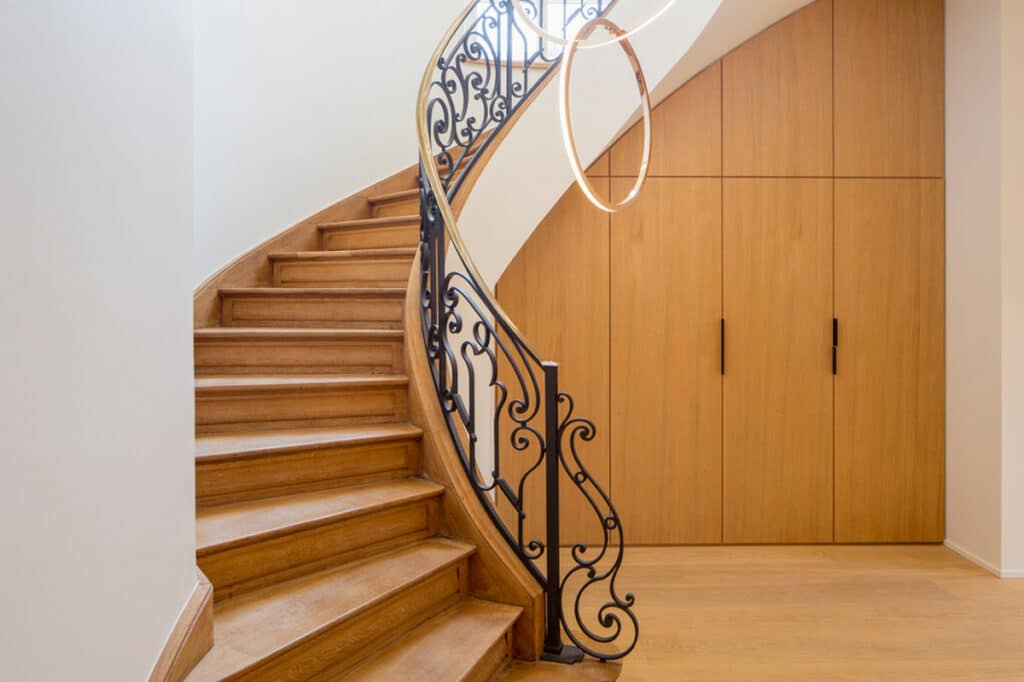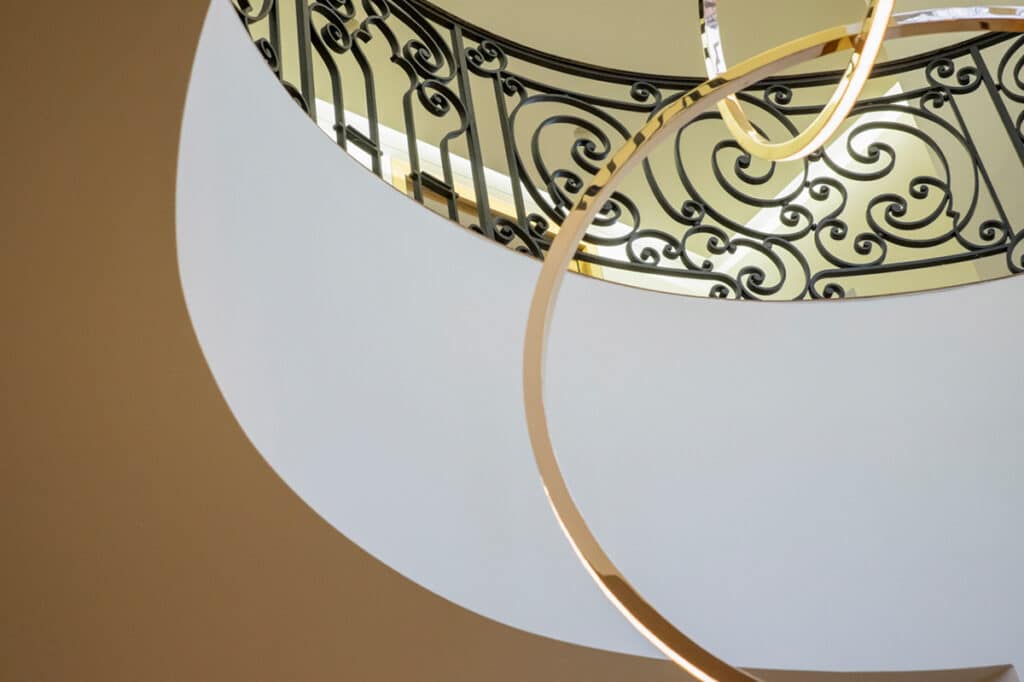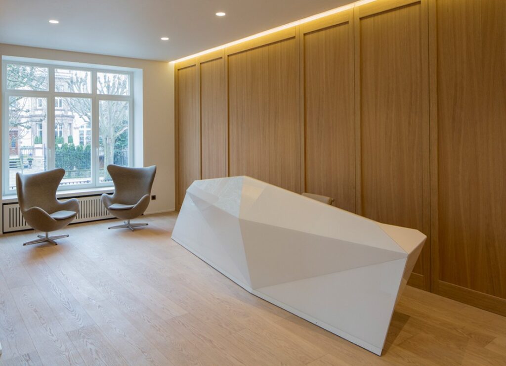 Pièce maîtresse de l’espace d’accueil, un comptoir blanc au dessin fractal structure l’entrée et dialogue subtilement avec l’escalier historique, mis en valeur comme un élément central du projet. L’organisation intérieure permet d’accueillir dix postes de travail, dans une atmosphère élégante, fonctionnelle et respectueuse de l’âme du lieu.
