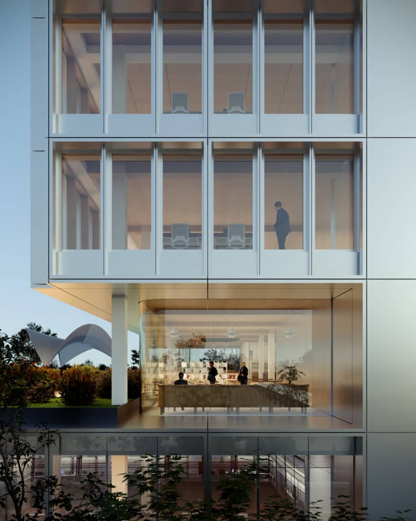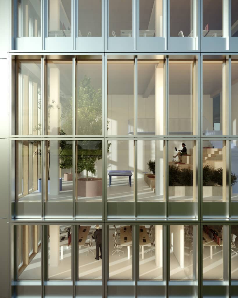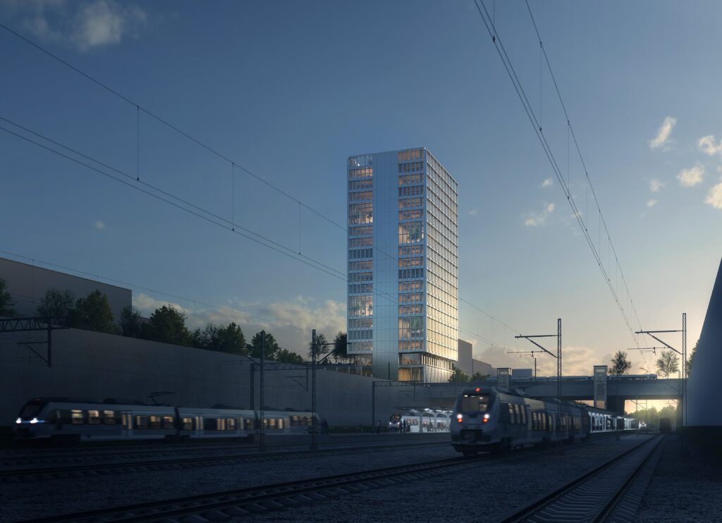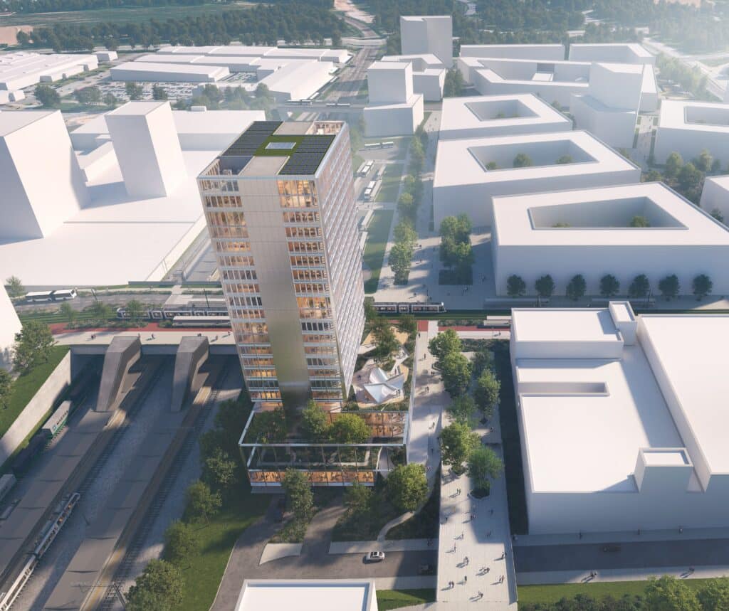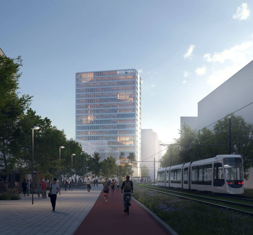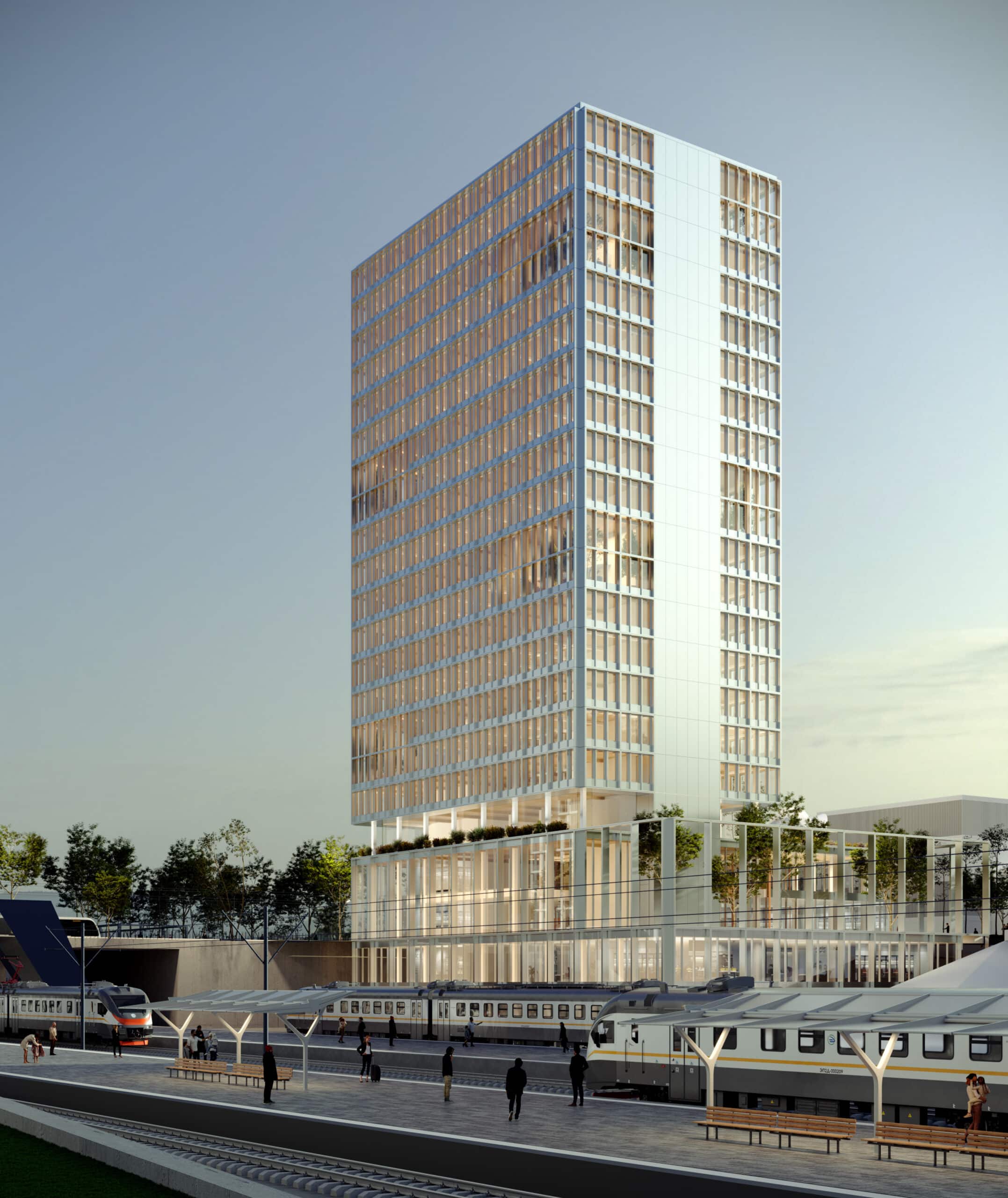 La tour CFL, haute de 75 mètres, dialogue avec les constructions voisines et s’intègre à la skyline luxembourgeoise, au même niveau que les tours du Kirchberg. Sa façade vitrée et lumineuse en fait un repère visuel fort, semblable à une lanterne dans le nouveau pôle multimodal. Positionnée près des voies ferrées, elle préserve l’ensoleillement des bâtiments voisins tout en créant des zones d’ombre modérées et agréables en été. La végétation en terrasse et le pavillon réduisent l’impact des vents dominants.