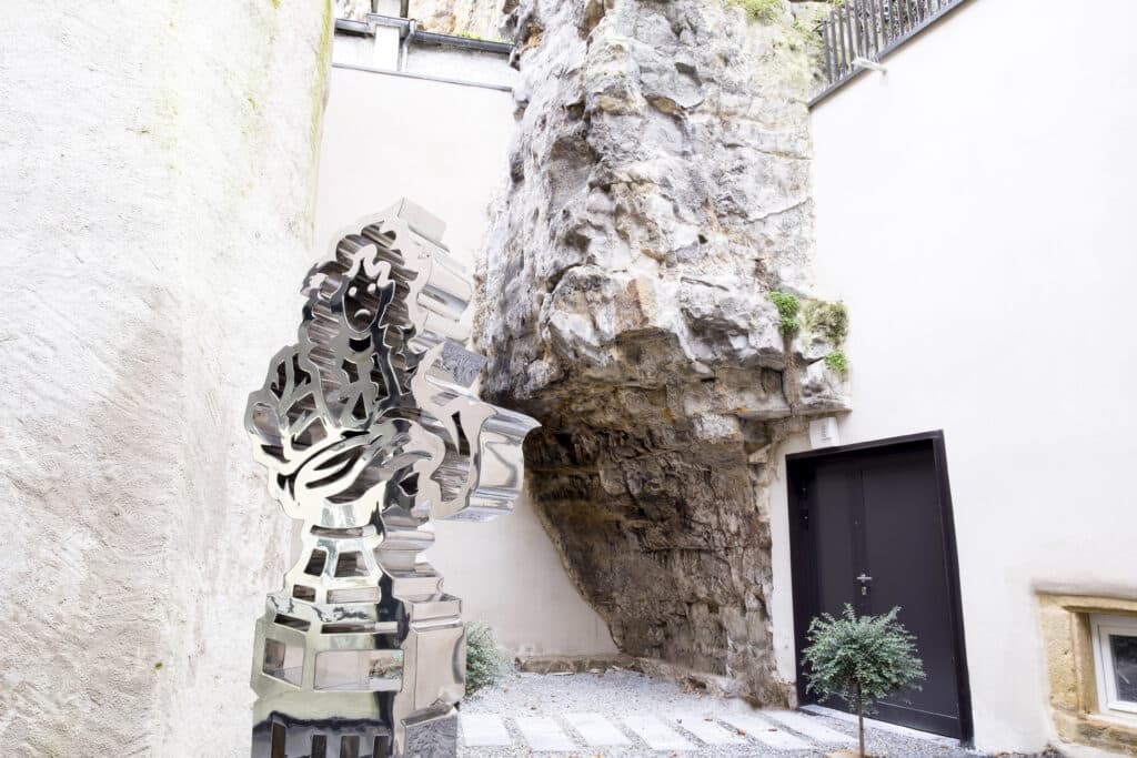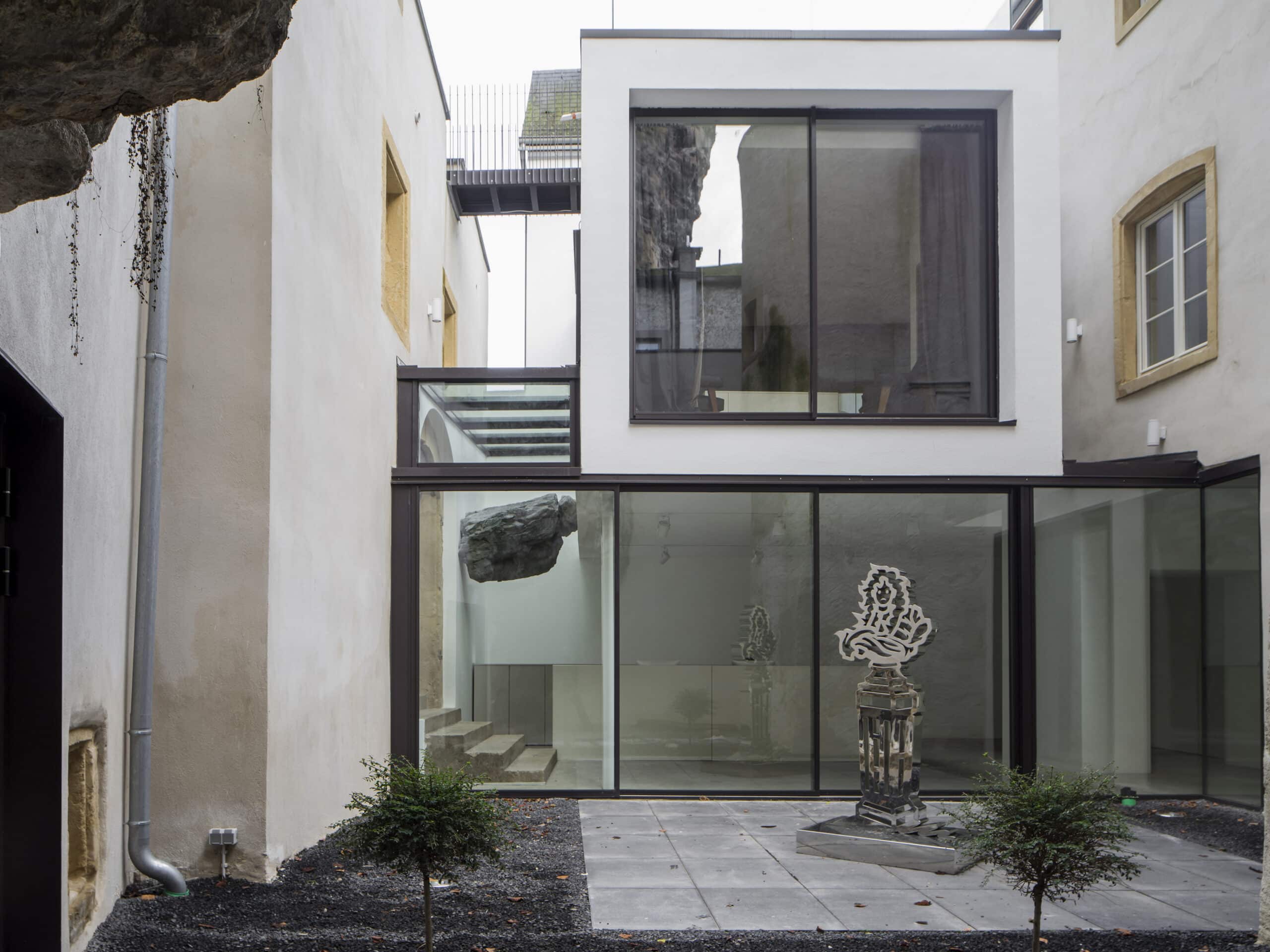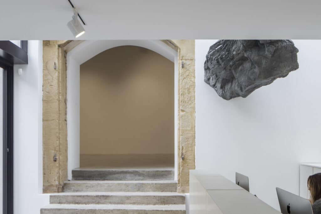 Les caves, creusées dans la roche, ont été entièrement réhabilitées. Leur géométrie brute et singulière offre un écrin propice à la mise en valeur des œuvres d’art. Un volume contemporain, tourné vers la cour, vient relier harmonieusement le bâtiment principal aux espaces souterrains, créant un dialogue entre l’ancien et le nouveau.